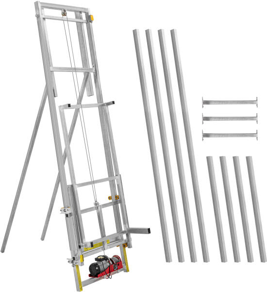 A nagy teljesítményű, 1500 W-os motorral ellátott cserépfelvonó lift 12 m/perc sebességgel akár 200 kg emelésére is képes. A ferdepályás cserépfelvonó nagy emelőkapacitásának köszönhetően hatékonyan szállíthat anyagokat, szerszámokat vagy napelemes rendszereket tetőkre és emeletekre. 150 x 70 cm-es platformjával az építőipari emelő akár 10 m-es magasságkülönbségeket is képes leküzdeni. Függőleges kialakításának köszönhetően a létrás emelő ideális különböző építési projektekhez, beleértve a lapostetőket és más speciális körülményeket Az építőipari felvonó alacsony súlyú és intelligens kialakítású és lehetővé teszi a hatékony szállítást, valamint a gyors szétszerelést és összeszerelést. A különleges kialakítás növeli a rugalmasságot az építkezésen, ugyanakkor minimalizálja a logisztikai és tárolási költségeket. Az építőipari emelő fejlett biztonsági funkciókat kínál. A ferdepályás cserépfelvonót kényelmesen, biztonságos távolságból vezérelheti a meghosszabbított kábellel (5 m) ellátott távirányítóval. A végállás, a vészkapcsoló és a túlterhelés elleni védelem optimális védelmet biztosít a kezelő és a szállított áru számára az emelési folyamat során.